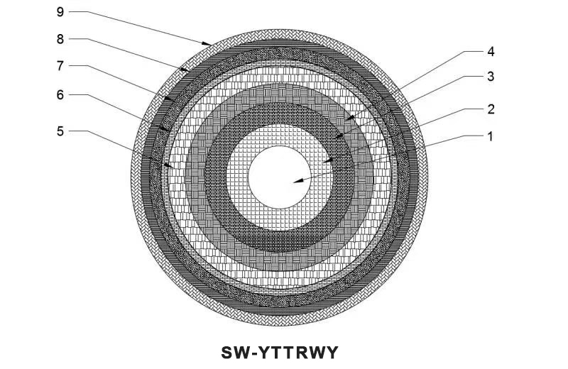 1)导体,2)无机绝缘层,3)绝缘增强层,4)无机填充层,5)阻燃防火包带层。6)防火内衬层, 7)铜护套屏蔽防火层, 8)陶瓷化防火隔氧层, 9)无卤外护层。