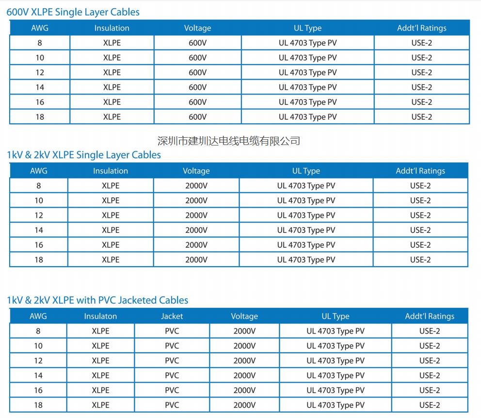 UL4703认证光伏电缆,简称UL光伏电缆,是单导体,绝缘和非完整套,耐阳光,光伏电缆,使用温度在-40°C湿或90°C干燥的环境,额定电压为600 V接地和不接地接线用